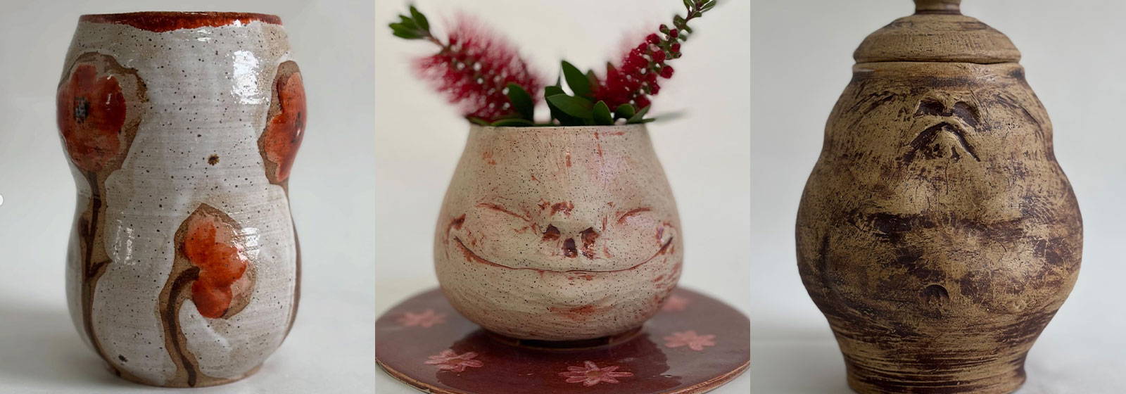 I create one of a kind ceramic pieces that typically incorporates floral surface designs or wall distortion to sculpt humanoid faces.