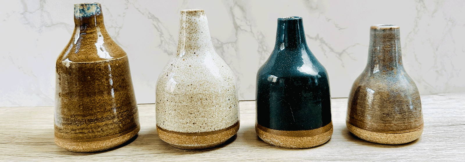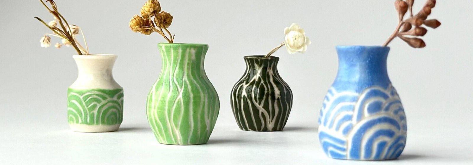 Handcrafted miniature ceramic vases, wheel-thrown and hand-built, glazed and kiln-fired at home in the Outer Sunset. My style evokes whimsy through bright colors, playful textures, and hand-drawn designs.
