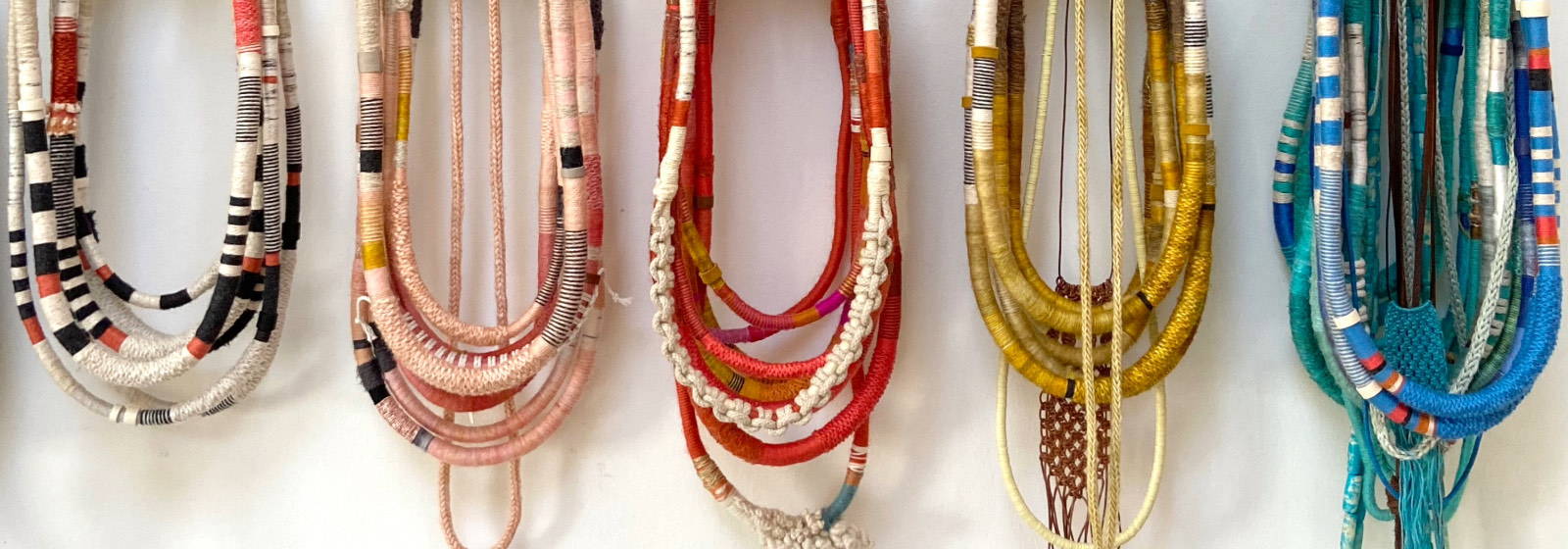 Rachel T. Robertson is a San Francisco artist and maker who has equal passion for fine art and craft. Working in both two and three dimensions, Rachel creates pieces with depth, texture and simplicity. In her one-of-a-kind jewelry pieces she works with texture, subtle variations of color and layered effects. Each piece is made by hand in her San Francisco studio using a range of primarily natural fibers and upcycled leather. In addition to designing and making a line of fiber jewelry, Rachel is also a fine artist working most often in mixed media on paper.